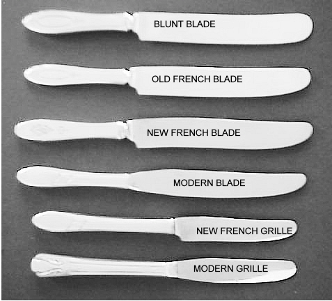 Flatware knives were made in a variety of styles, lengths, and materials. If an exact match of style and type is needed, it is important to identify the knife blade you wish to order. Knife styles, lengths and blade materials often varied by manufacturer and year. The most common luncheon and dinner knife blade types are blunt, old French, new French, and modern. Grille (viande) knives can be new French or modern blade. Each of these are shown in the image below.